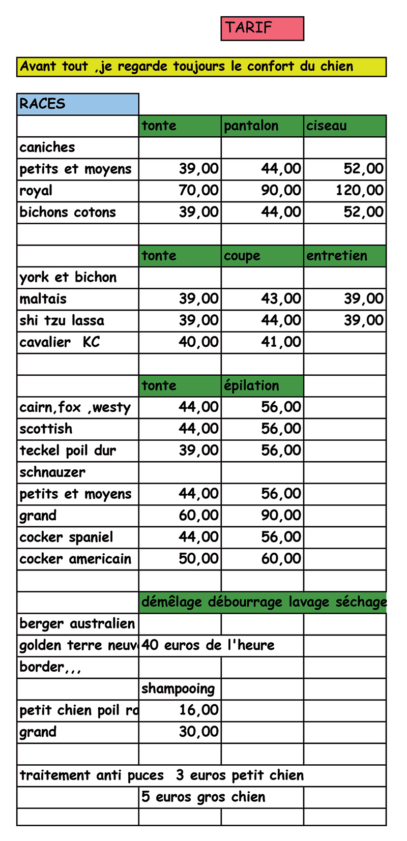 j’accepte de démêler uniquement ce qui est DEMELABLE !!!!si votre chien est trop emmêlé ,je ne vais pas tirer dessus pendant une heure pour vous satisfaire , c'est douloureux pour le chien et cela peut l'irriter ,alors à vos brosses ,je ne suis pas là pour faire souffrir votre chien !