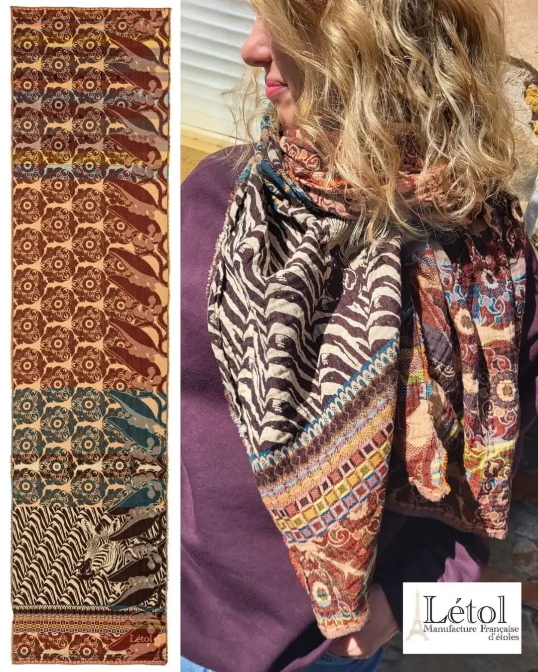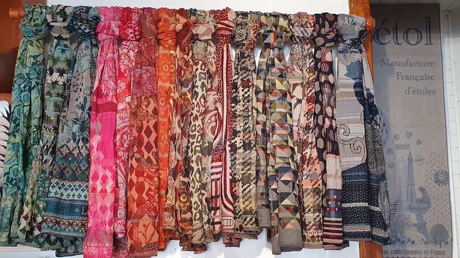 Chez Létol, les écharpes sont en tissage jacquard : La particularité est de créer un motif par l'entrecroisement des fils de coton.
