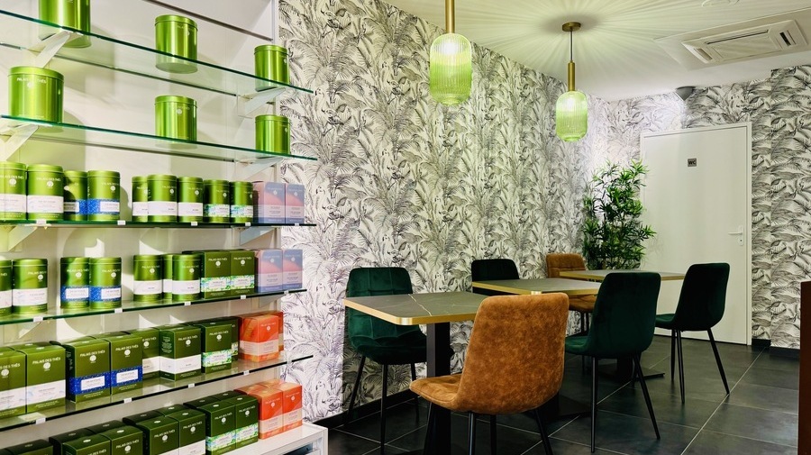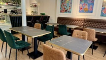Une petite terrasse vous accueille ainsi que des jolies tables à l'intérieur dans un cadre moderne, apaisant et climatisé.