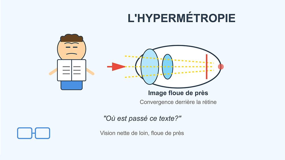 L'hypermétropie est un trouble de la réfraction où l'image se forme en arrière de la rétine plutôt que directement sur celle-ci. Contrairement à une idée reçue, l'hypermétrope ne voit pas forcément bien de loin : il doit accommoder en permanence pour voir net, quelle que soit la distance.