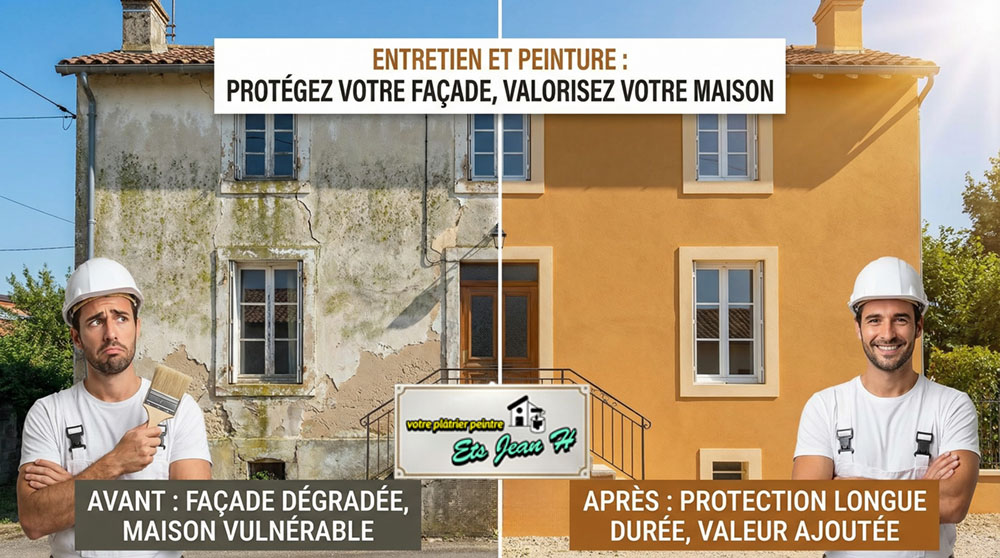 Quand on est propriétaire, on pense souvent à l'intérieur de sa maison : la cuisine à rénover, le salon à rafraîchir, la chambre des enfants à repeindre. La façade, elle, on l'oublie facilement. Pourtant, c'est elle qui protège votre foyer au quotidien, face aux intempéries, à l'humidité et aux années qui passent. Aux établissements Jean H, artisan plâtrier peintre à Bergerac, on le sait mieux que quiconque : une façade en bon état, c'est une maison qui dure.