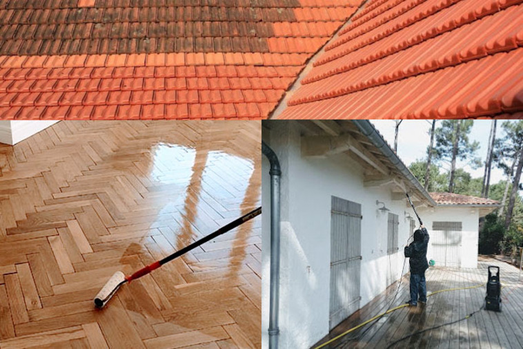 Vient ensuite le nettoyage en profondeur : brossage des mousses, traitement hydrofuge ou fongicide selon les matériaux, puis rinçage. Cette étape est indispensable pour garantir l'adhérence des produits de finition appliqués par la suite.