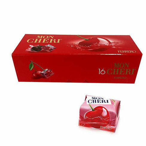 La boîte Mon Chéri propose de délicieux chocolats fourrés à la liqueur de cerise, emblématiques de la maison Ferrero.