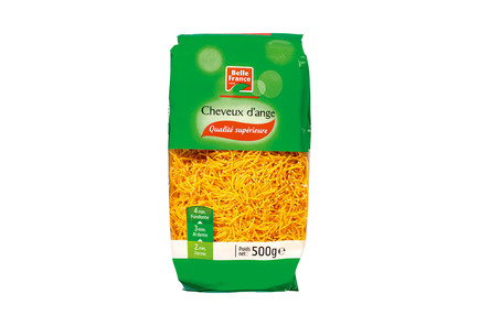 Les cheveux d’ange Belle France sont des pâtes très fines et légères, idéales pour des recettes délicates. Elles cuisent rapidement et conviennent aussi bien aux soupes, aux potages qu’aux plats de pâtes légers. Un produit simple et pratique pour varier les repas du quotidien.