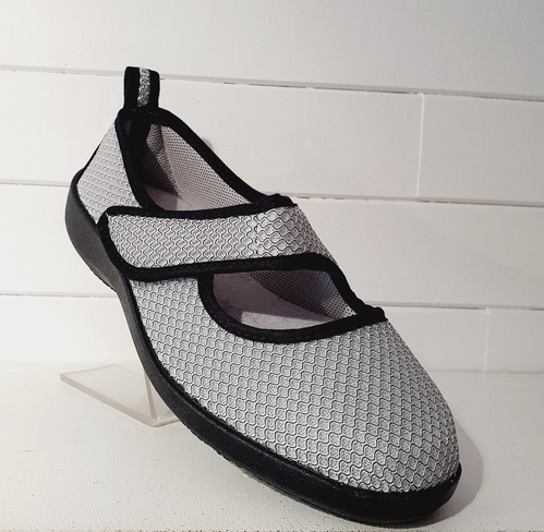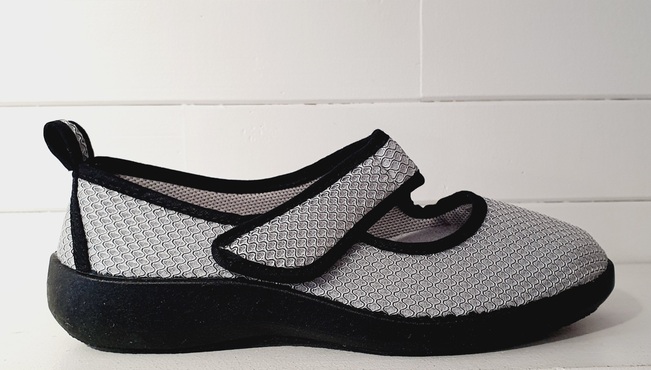 Ce chausson femme en textile gris perle offre une large ouverture pour insérer facilement les pieds sensibles.