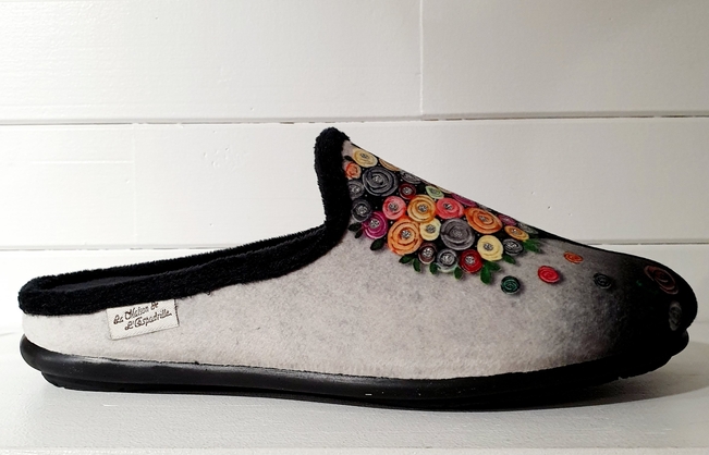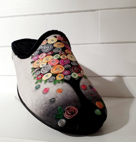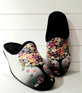 Chausson mule, dessus textile imprimé thème "arbres à fleurs".