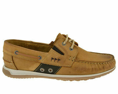 Chaussure type bateau en cuir aspect peau de pêche, avec des nuances et des coutures contrastantes.