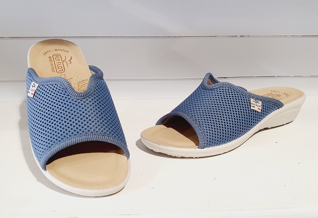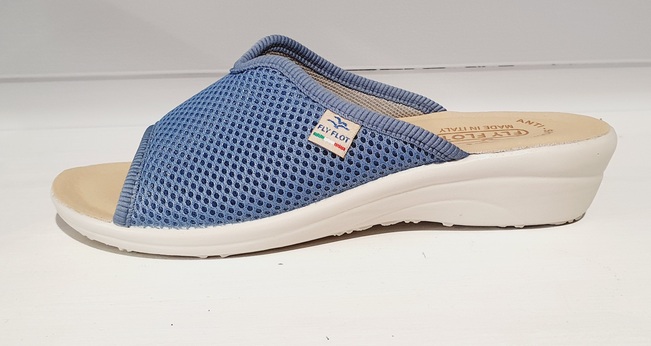Mule ouverte en textile maille de couleur bleu ciel, avec un biais sur le pourtour pour une jolie finition.