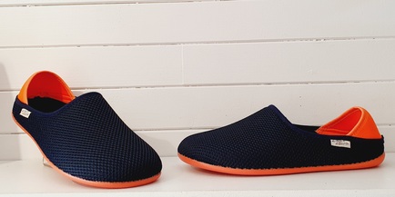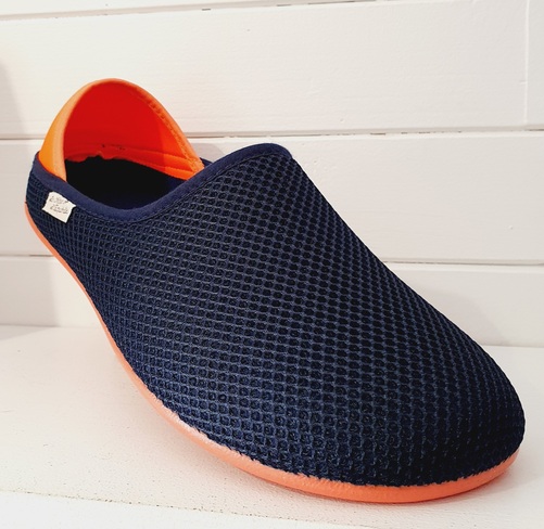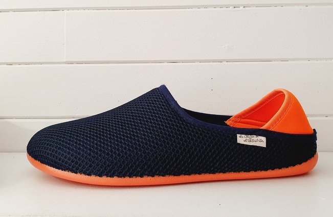 Version mule ou version fermée 2 possibilités pour ce chausson tissu nid d'abeille de couleur marine et semelle orange.
