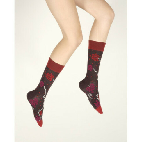Les chaussettes "couleurs d'automne" vous plongent dans une forêt tapissée de feuilles mortes : le fond bordeaux et les feuilles virevoltantes rappellent cette ambiance automnale, moment de l'année où nous ressortons tous nos petites laines !