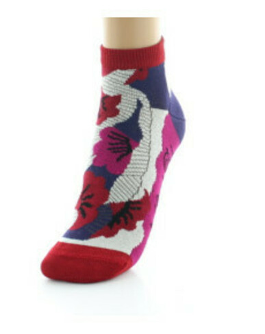 L'association des coloris rouge, rose, noir et ivoire apportent à ce modèle une énergie et une vivacité appréciées par nos pieds. Des coquelicots de couleurs rose fuchsia et rouge vif éclosent de part et d'autre sur le pied, stimulant le fond raisin de ce modèle.