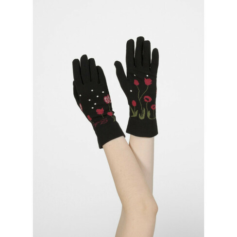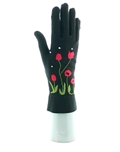 Le fond noir de ces gants dévoile des fleurs rouges mises en relief par un feuillage vert.