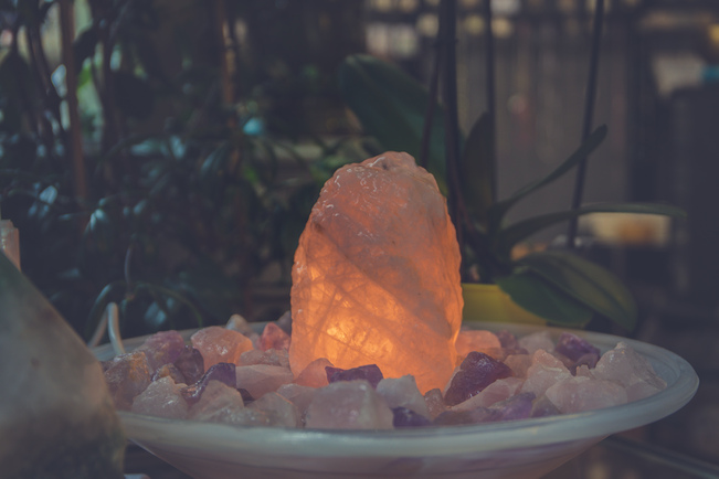 fontaine en quartz rose avec des pierres de quartz rose, amethyste et cristal de roche dans une vasque de 35 cm environ.