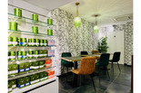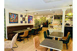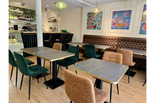 Une petite terrasse vous accueille ainsi que des jolies tables à l'intérieur dans un cadre moderne, apaisant et climatisé.