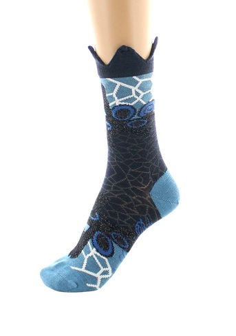 Isidore Odorico est un artiste du début du XXème siècle. Ses œuvres ont inspiré ces chaussettes fantaisie pour femme. Le motif en maille dévorée, tout comme les fissures blanches lézardant sur un fond bleu Islande, font référence aux mosaïques monumentales réalisées par cet Italo-Breton. La couronne coiffant le haut de tige est elle une référence à la reine Bertrade de Laon. Cette souveraine, plus connue sous le sobriquet de "Berthe au grand pied" a inspiré le nom de notre marque.