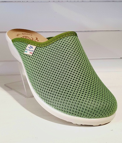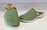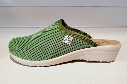 Mule en textile maille de couleur verte, avec un biais sur le pourtour pour une jolie finition.