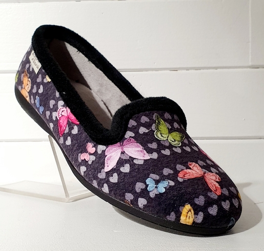 slippers ou Chausson type mocassin, dessus textile noir imprimé papillons multicolores.
