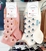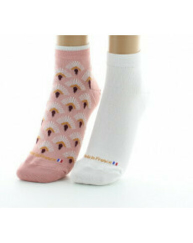 Ces deux modèles, tout en légèreté et en féminité, arborent chacun des couleurs pastel et tendances : le premier modèle est tricoté en fond vieux rose, avec les motifs blanc argenté, violet et moutarde accompagné d'une paire unie blanche.
